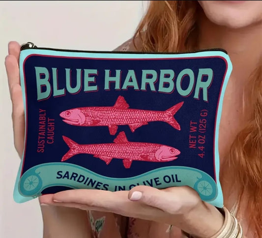 Mini Sardine Can Cosmetic Bag, Blue Harbor, Retro Canvas Zippered Case