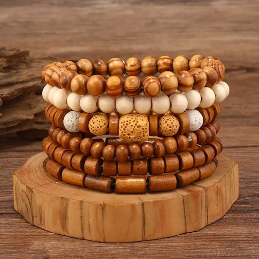 Conjunto de 6 pulseiras elásticas de contas de madeira com inspiração vintage - elegante